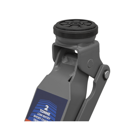 Heavy-duty chassis with strengthening flanges along the top edge for extra torsional rigidity under load. Profiled lifting arm allows low clearance height of just 85mm making this unit suitable for sports and custom cars. Fitted with heavy-duty one-piece hydraulic unit with pump-through action preventing handle locking at maximum ram extension. White saddle aids positioning under vehicle and safety valve prevents overloading. Type A rubber jack pad included.