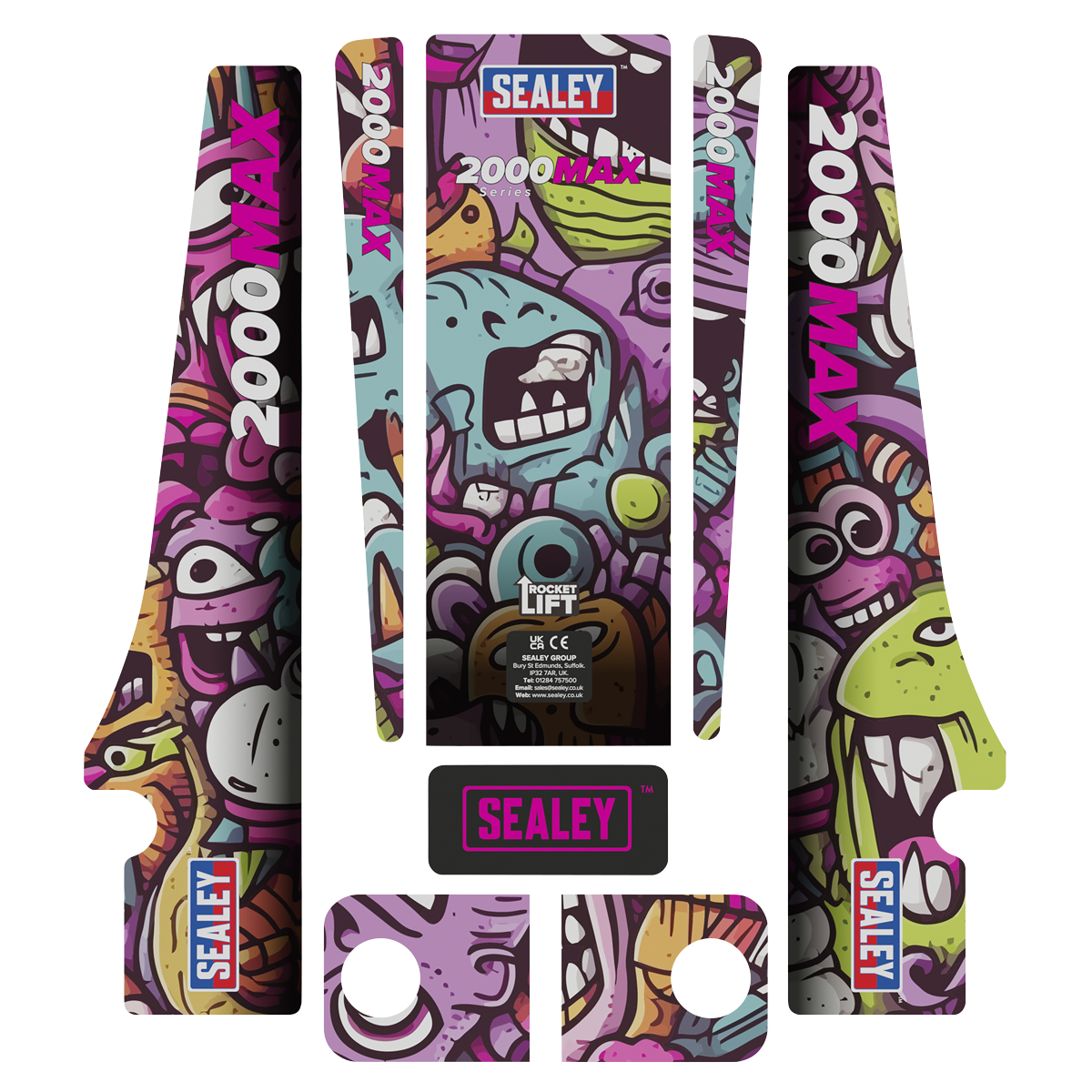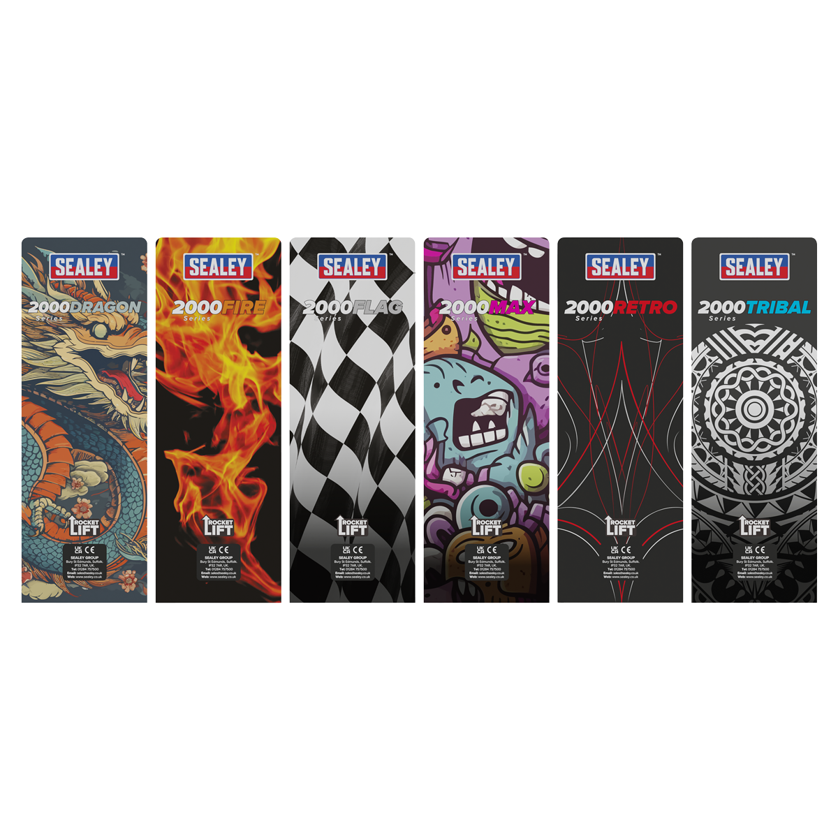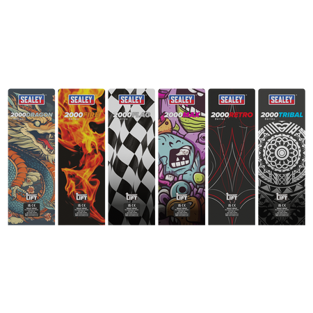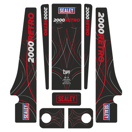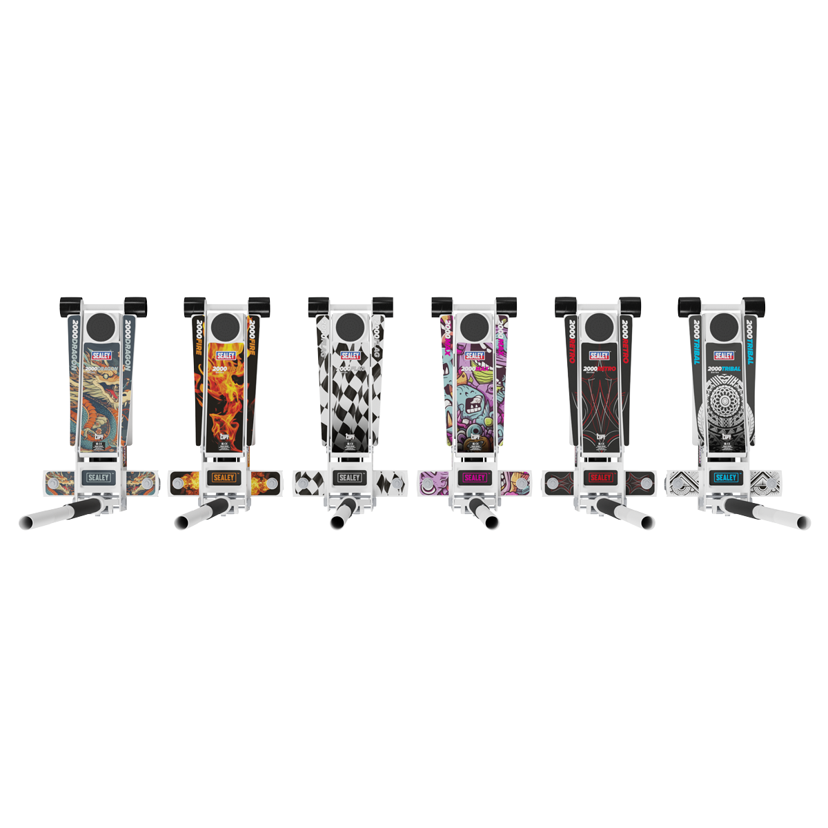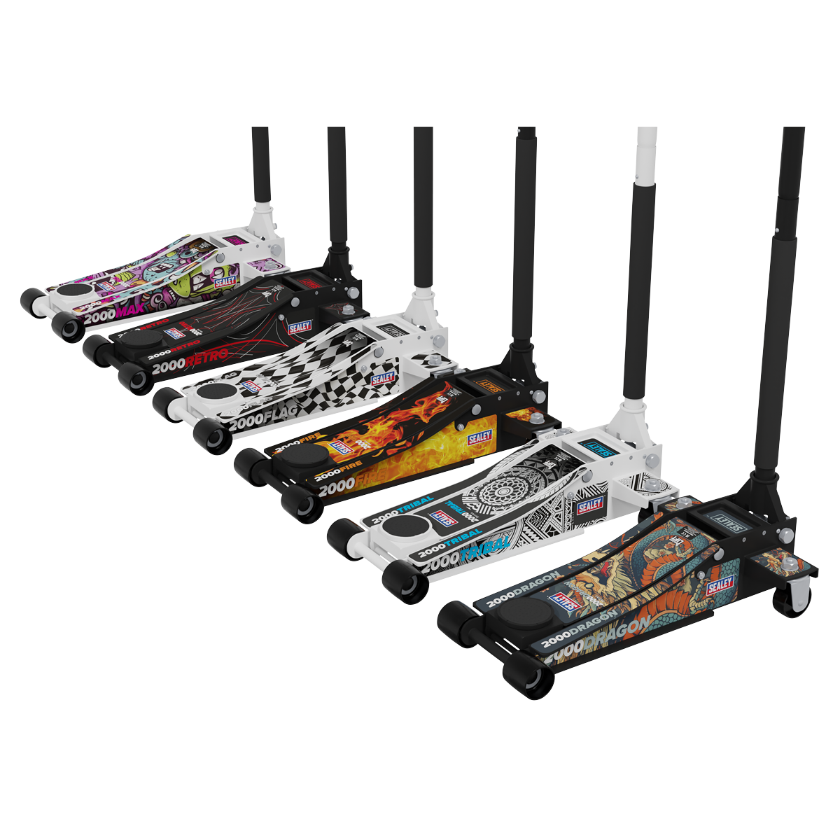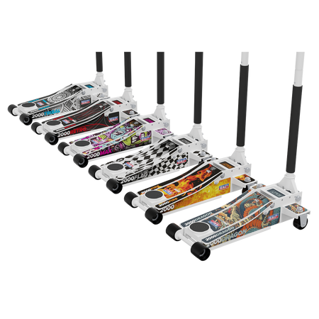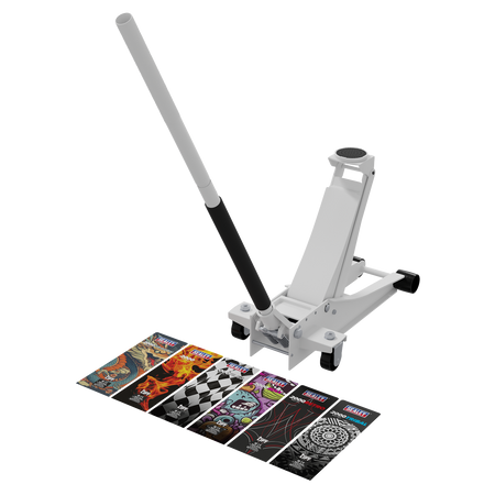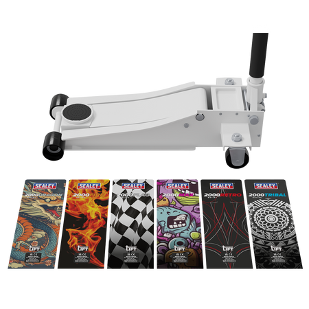Supplied with 6 full sets of interchangeable graphics for individual customisation of the jack. Twin piston Rocket Lift feature brings saddle to maximum height in minimal strokes. Universal joint release mechanism allows safer, more controlled lowering of jack. Profiled lifting arm gives low clearance height of just 85mm making it suitable for sports and custom cars. Heavy-duty steel chassis provides stability and endurance. Fitted with an overload valve for added safety. Hydraulic oil bypass system protects ram from being overextended. Fitted with safety overload valve and pump-through valve to prevent handle locking at maximum ram extension.