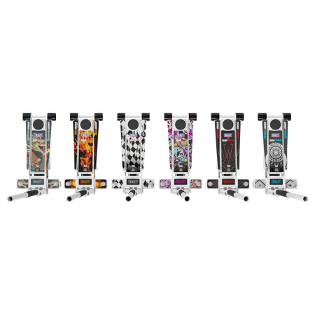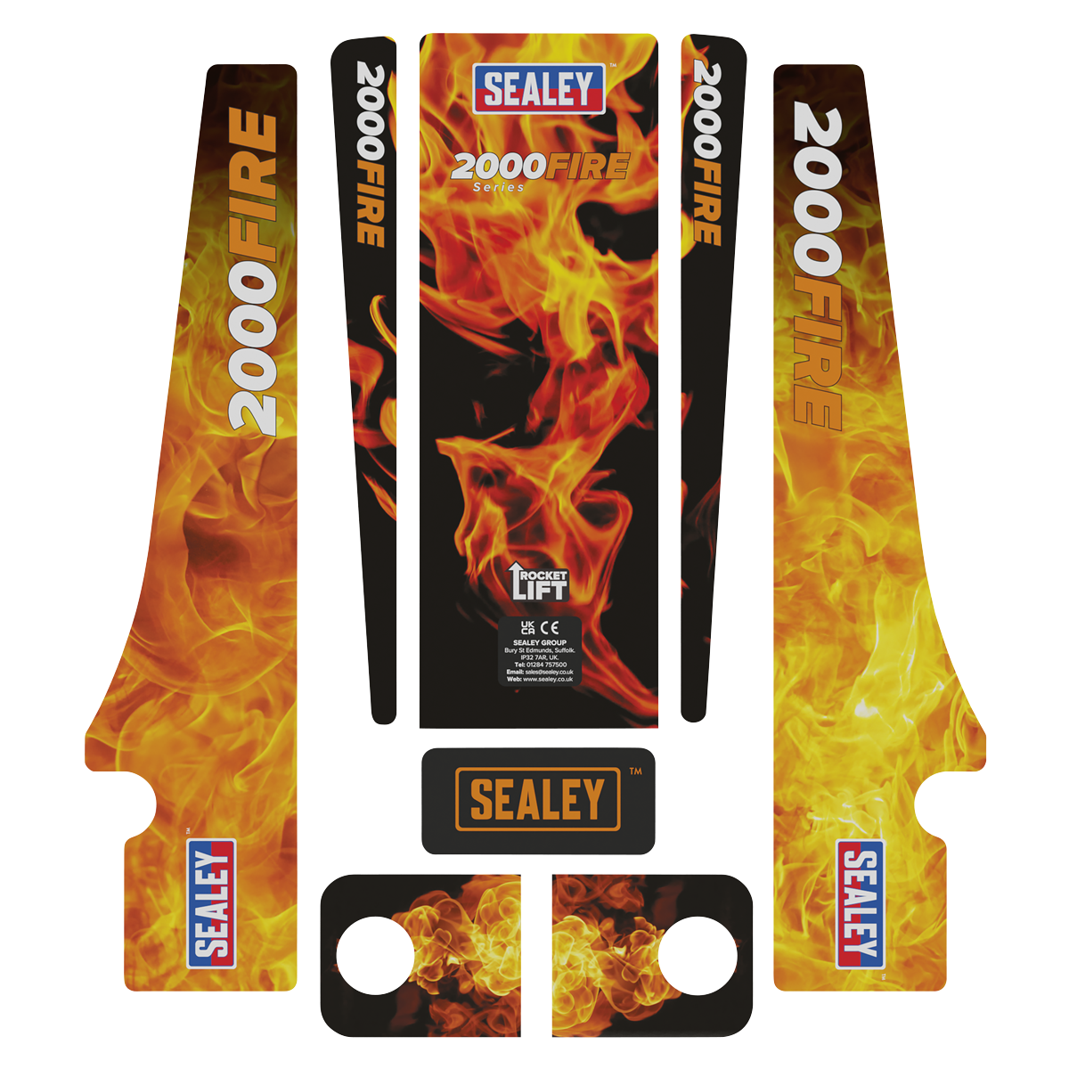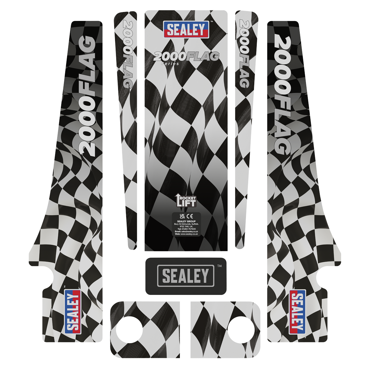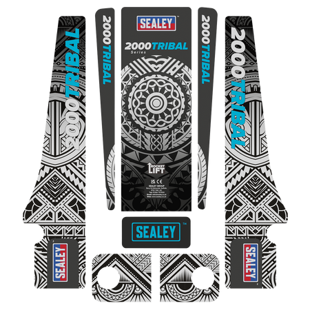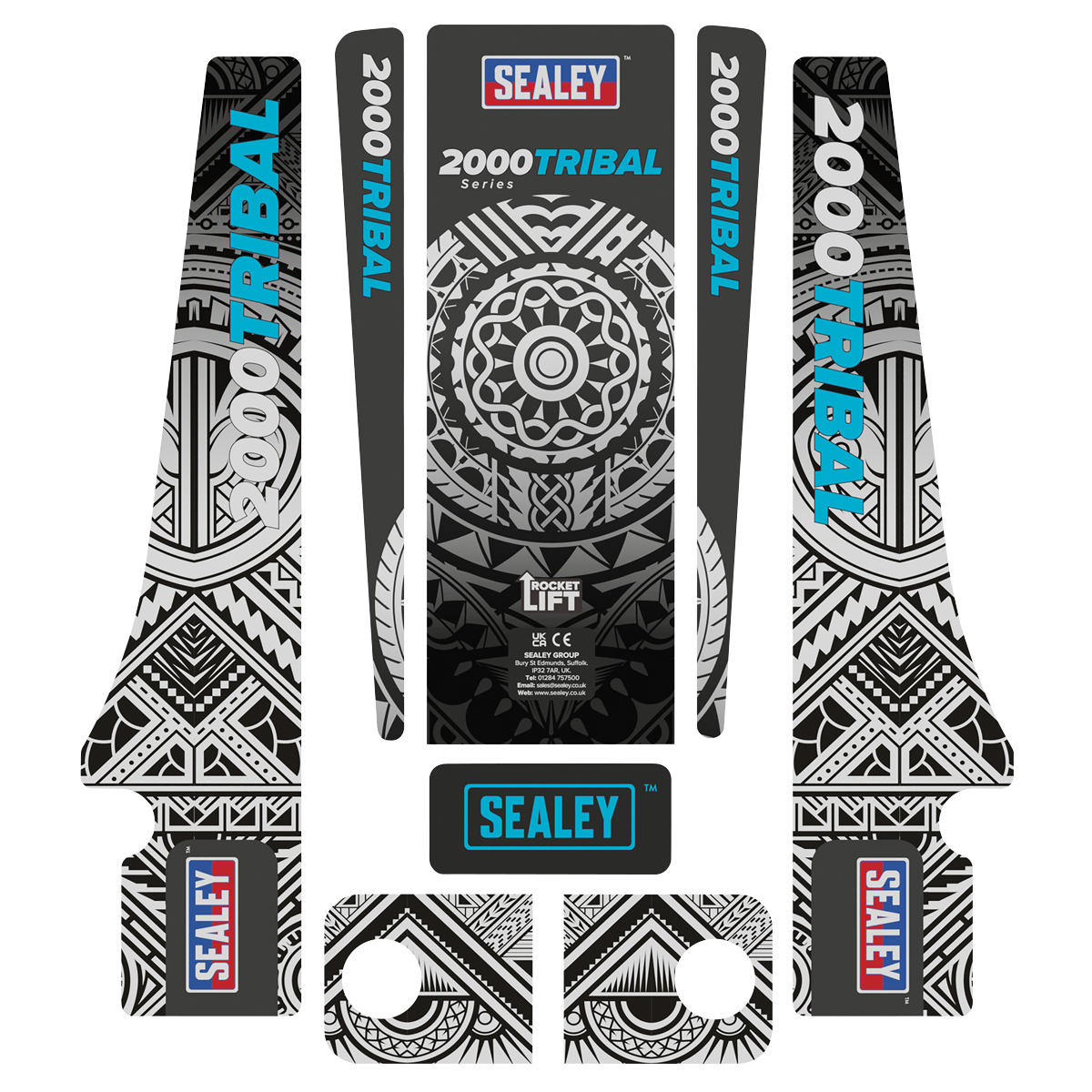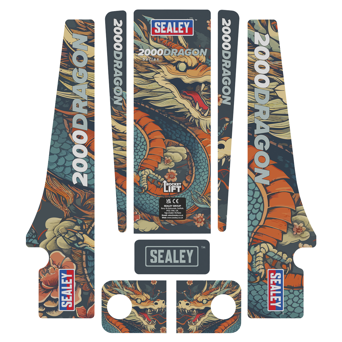 Supplied with 6 full sets of interchangeable graphics for individual customisation of the jack. Twin piston Rocket Lift feature brings saddle to maximum height in minimal strokes. Universal joint release mechanism allows safer, more controlled lowering of jack. Profiled lifting arm gives low clearance height of just 85mm making it suitable for sports and custom cars. Heavy-duty steel chassis provides stability and endurance. Fitted with an overload valve for added safety. Hydraulic oil bypass system protects ram from being overextended. Fitted with safety overload valve and pump-through valve to prevent handle locking at maximum ram extension.
