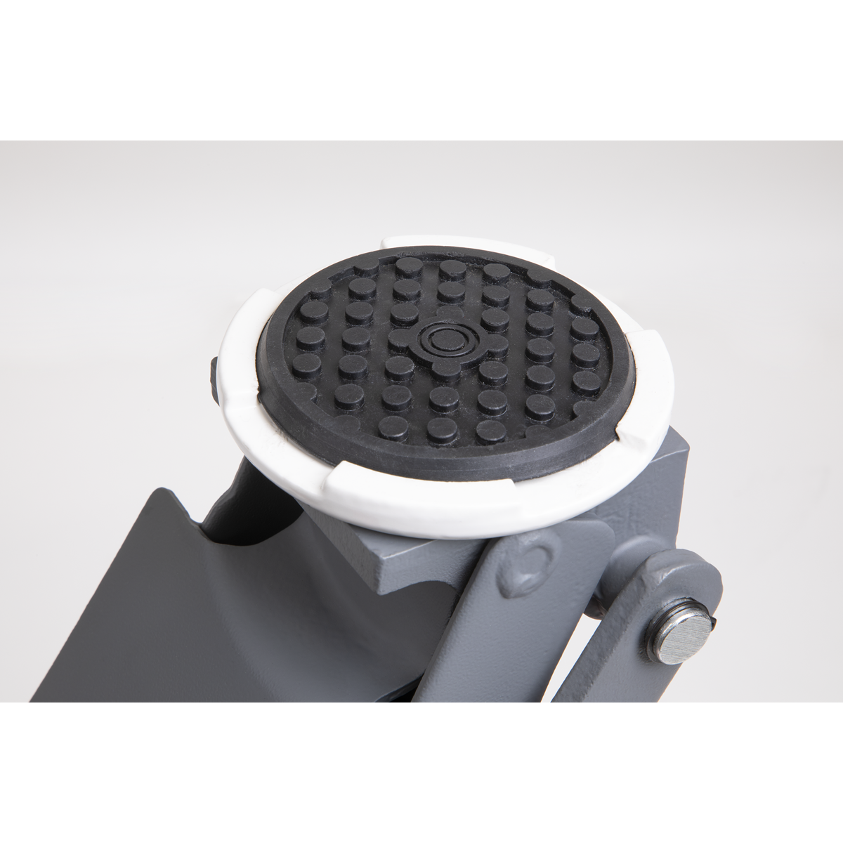 Twin piston Rocket Lift feature brings saddle to maximum height in minimal strokes. Universal joint release mechanism allows safer, more controlled lowering of jack. Profiled lifting arm gives low clearance height of just 73mm making it suitable for sports and custom cars. Heavy-duty steel chassis provides stability and endurance. Fitted with an overload valve for added safety. Hydraulic oil bypass system protects ram from being overextended.