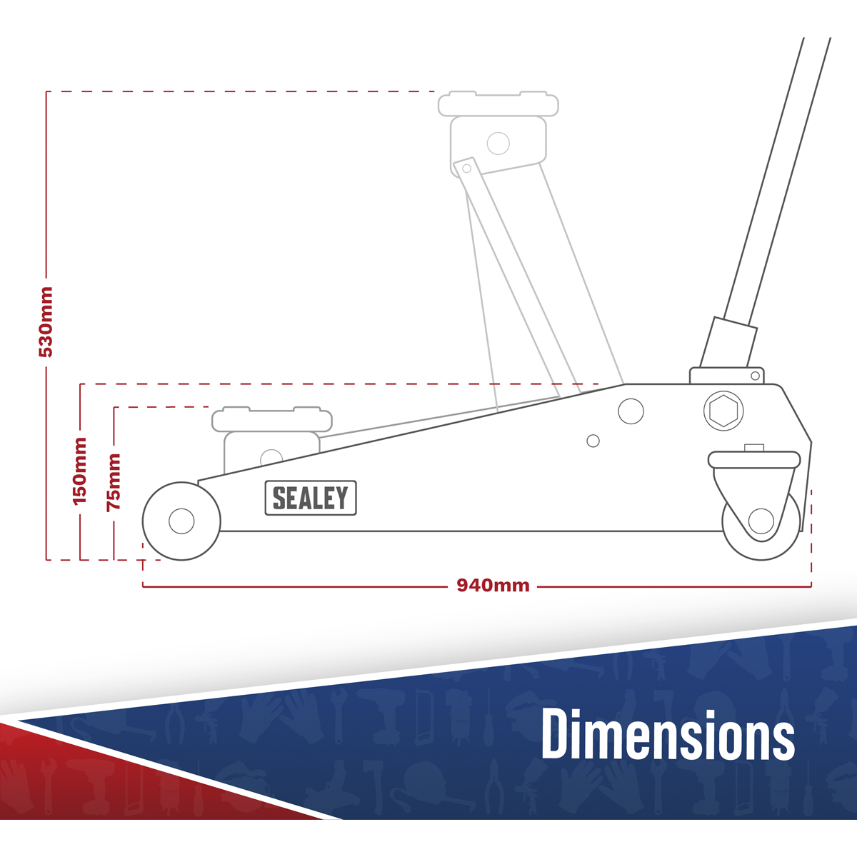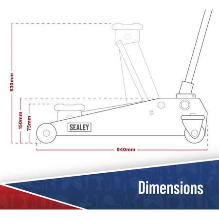 Dual piece hydraulic unit with heavy-duty long chassis provides easy-access to deep set jacking points. Lift-and-twist dead man's lowering mechanism operates via T-shaped handle providing a smooth, controlled lowering of the load and helping prevent accidental lowering. Rocket Lift feature brings lifting arm into contact with jacking point with minimal pumps. Polyurethane wheels provide smoother manoeuvrability and help prevent damage to workshop floor. Protective jack handle sleeve helps prevent accidental damage to car bodywork when pumping the handle. Foot pedal for quick approach of the lifting saddle to the vehicle in confined spaces. Includes removable rubber saddle pad and built-in tool tray for fasteners and tools. 3 Year Guarantee - 2nd and 3rd year subject to T&C's and registration on website (www.sealey.co.uk).