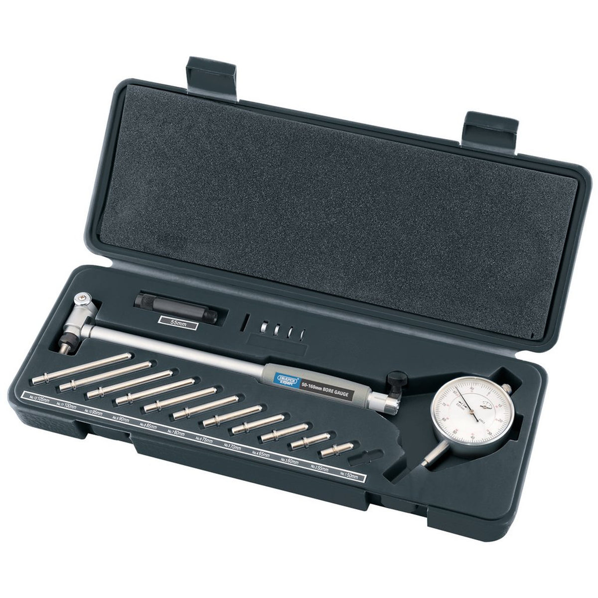 Contents: 3mm travel dial test indicator; 55mm extension bar; 4 spacer rings size: 0.5, 1.0, 2.0 and 3.0mm; 12 measuring rods size: 50, 55, 60, 65, 70, 75, 80, 85, 90, 95, 100 and 105mm