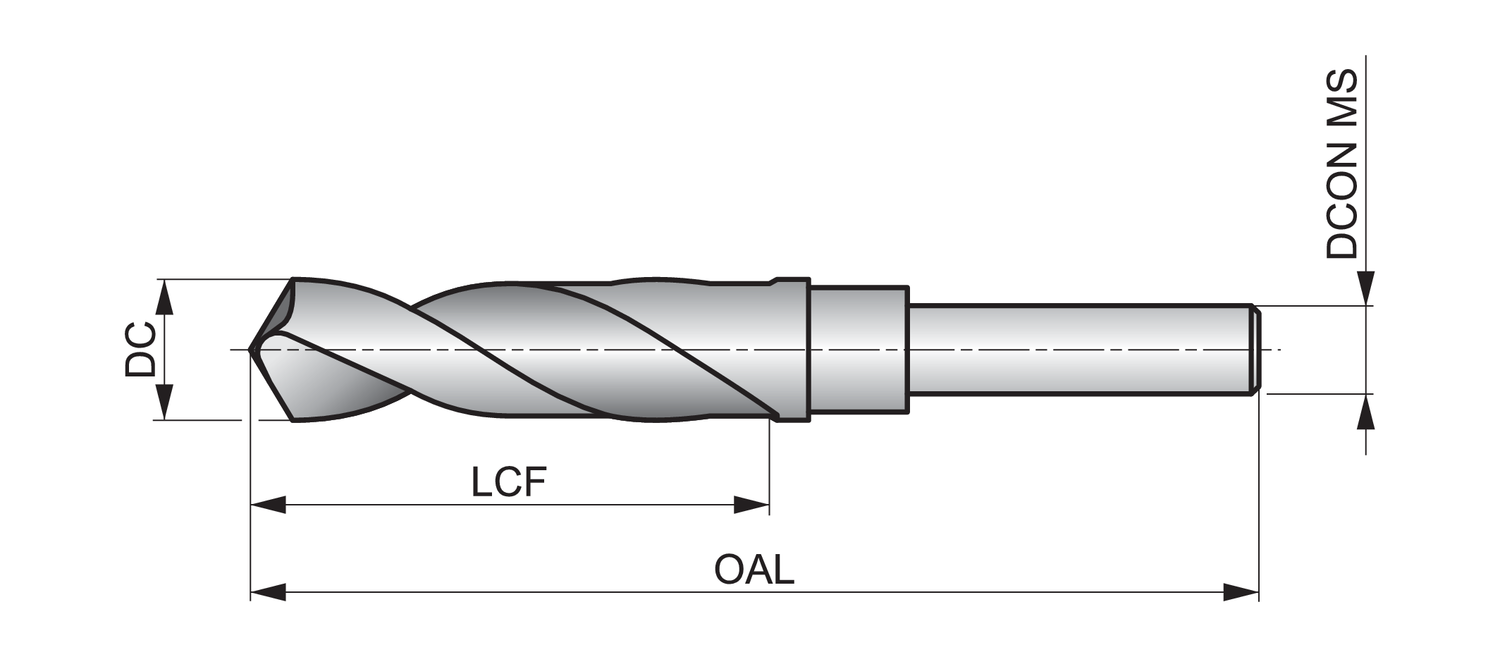 Standard length drill with 1/2" reduced straight shank, diameter 14mm with an overall length of 156mm and flute length of 83mm according to DORMER standard with 118° point angle, HSS with steam tempered finish for 4xD drilling without pecking in steel