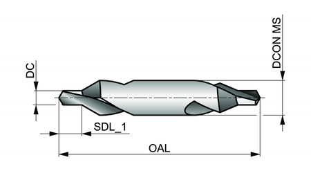 Centre drill (combined drill and countersink) with 60° straight conical form, double ended and cylindrical body, size BS4 with 1/8" drill diameter, a body diameter of 5/16" and an overall length of 2.1/4", according to BS 328 standard to produce form A centre holes, HSS and bright finish for machining free machining, plain carbon and alloy steel and grey cast-iron