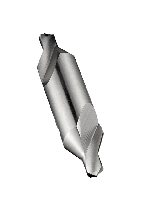 Centre drill (combined drill and countersink) with 60° straight conical form, double ended and cylindrical body, size BS6 with 1/4" drill diameter, a body diameter of 5/8" and an overall length of 3", according to BS 328 standard to produce form A centre holes, HSS and bright finish for machining free machining, plain carbon and alloy steel and grey cast-iron