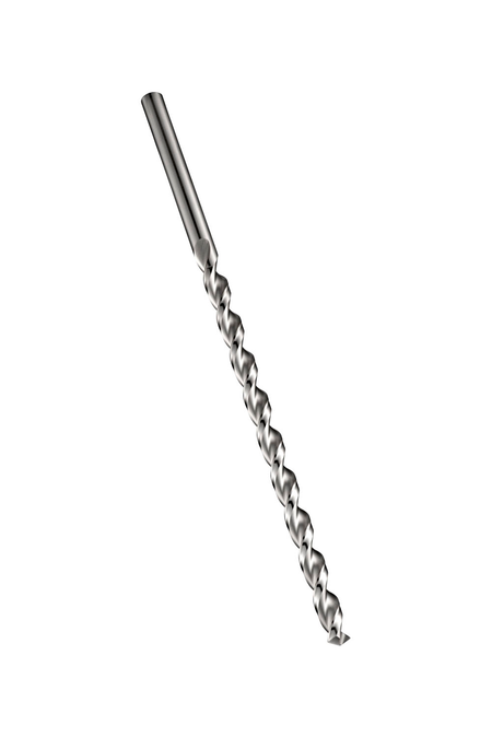 Extra long length PFX drill with straight shank, diameter 6.7mm with an overall length of 215mm and flute length of 150mm according to DIN 1869 / 1 standard with 130° point angle, cobalt based HSS-E with bright finish, quick spiral and parabolic web for 15xD drilling without pecking in steel