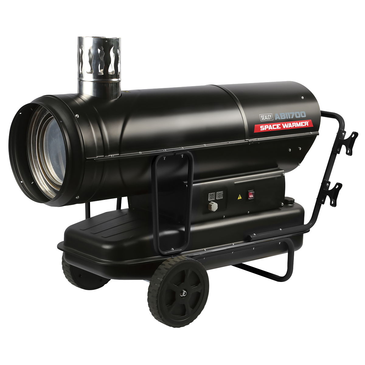 Indirect fired heaters are sophisticated, reliable, and highly efficient heaters. Ideal for places where there’s limited ventilation, or where people are present, as they deliver huge volumes of clean, dry, fume free heat safely and economically. The Sealey 170,000Btu/hr Indirect Space Warmer has a 50kW heat output ideal for heating marquees, events, halls, workshops, warehouses, construction sites and more. Combustion by-products are exhausted out of the top of the heater through the flue. With a thermostat control it allows you to set a required ambient temperature and maintain it. The thermostat will switch the heater on and off as required to maintain the set ambient temperature, this saves fuel and adds extra convenience. The indirect heater includes a stainless-steel combustion chamber with fan cooling, built-in flame sensor, Danfoss pump, electronic flame control and electronic control panel which ensures reliable performance. Fitted with a flame-out device which cuts the fuel supply when the flame is inadvertently extinguished or if the fuel has run out, ensuring maximum safety. Suitable for use with Kerosene or Diesel. Large wheels and a handle make the heater easy to transport, position and re-position where required on site. Ducting is available, Model No. ABI1700AK1 sold separately. Flue system with rain cover is available, Model No's ABI1700AK2, ABI1700AK3m ABI1700AK4 sold separately.,• HEAT OUTPUT - 50KW/170,000Btu/hr ideal for heating marquees, events, halls, workshops, warehouses, construction sites and more.