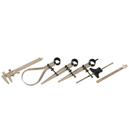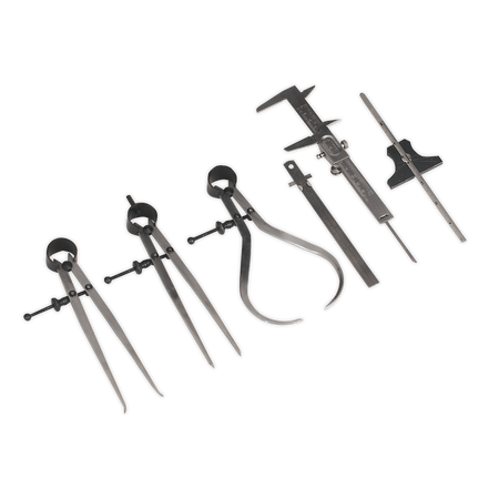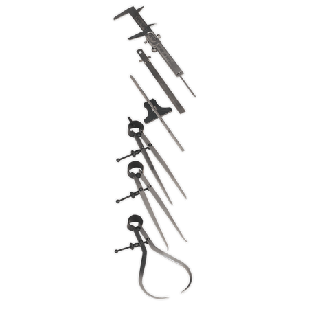 • Contains: Vernier Calipers, Depth/Angle Gauge, External Calipers, Dividers, Internal Calipers, Pocket Rule with Clip.