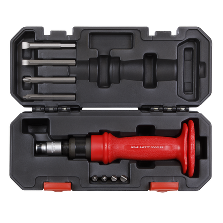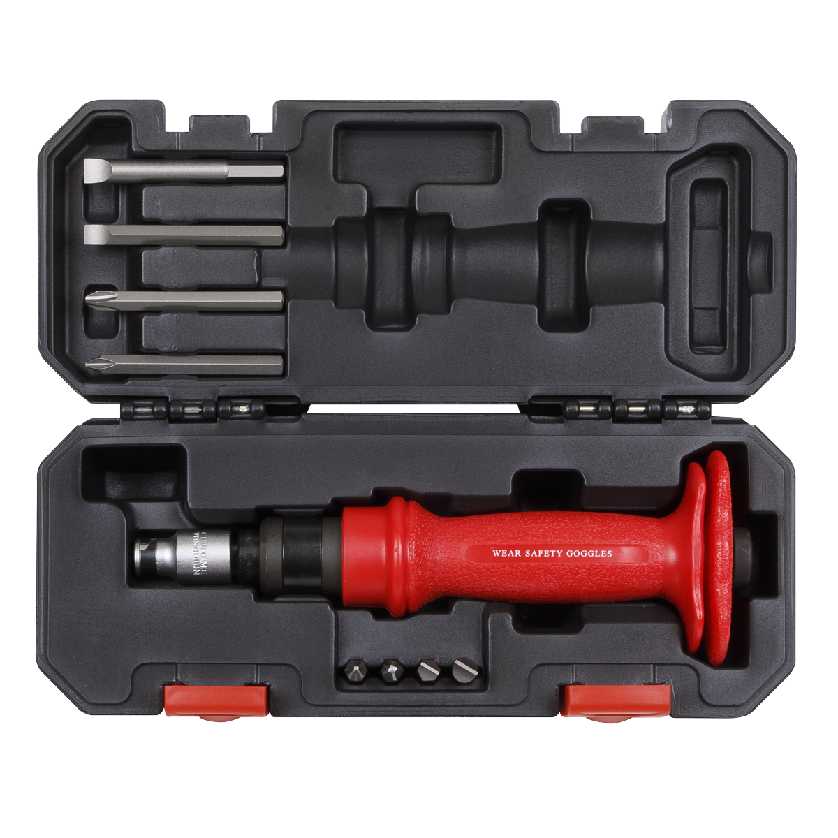 Heavy-duty 1/2"Sq drive impact driver with composite handle and integral knuckle guard. Features twist-reverse for operation in either direction. Supplied with 8pc Chrome Vanadium steel driver bit set and 8mm hex drive adaptor. Supplied in storage case.