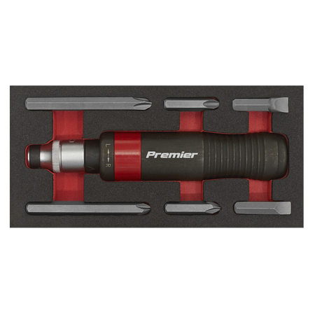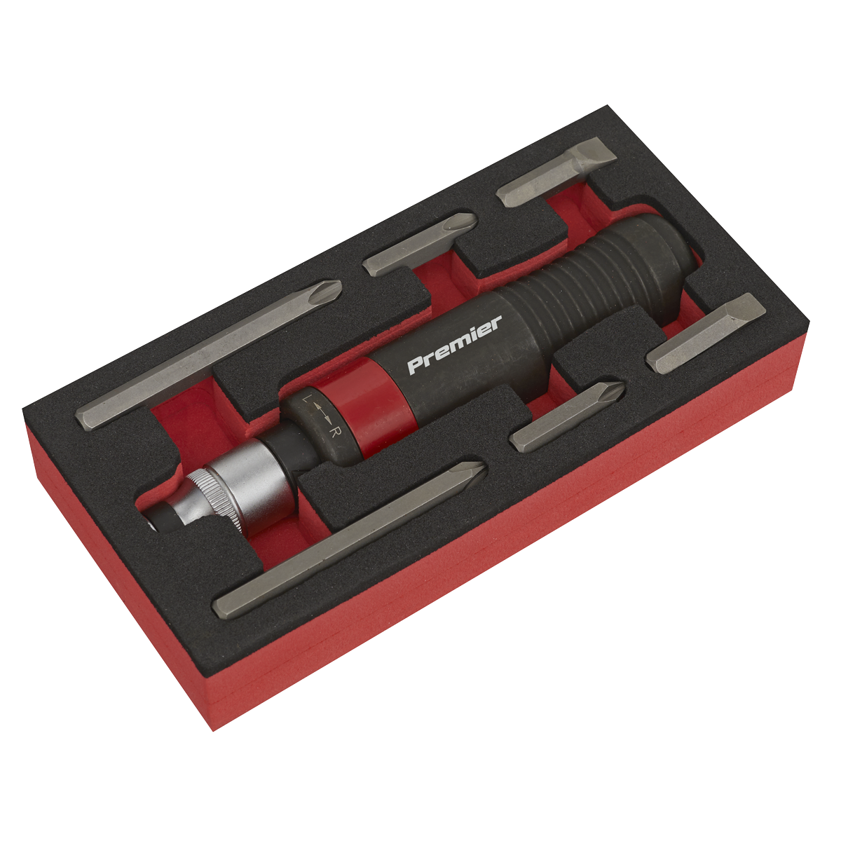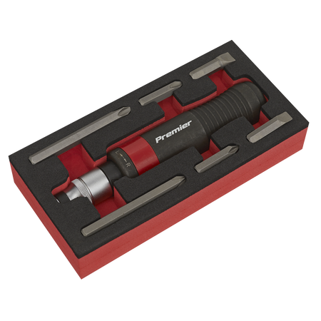 Professional 1/2"Sq drive impact driver with contoured grip and phosphate finish. Features twist-reverse for operation in either direction. Supplied with 6-piece Chrome Vanadium steel driver bit set and 8mm hex drive adaptor.