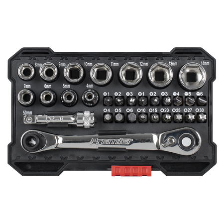 - Contents 1/4"Sq Drive Sockets; 4, 5, 6, 7, 8, 9, 10, 11, 12, 13, 14mm, 50mm Extension Bar, 1/4"Hex - 1/4"Sq Drive Micro Ratchet Bit Driver/Wrench, Bits; Slotted - 4, 5, 6, Phillips - #1, #2, #3, Pozi- #1, #2, #3, TRX-Star* - T10, T15, T20, T25, T27, T30, Hex - 4, 5, 6mm