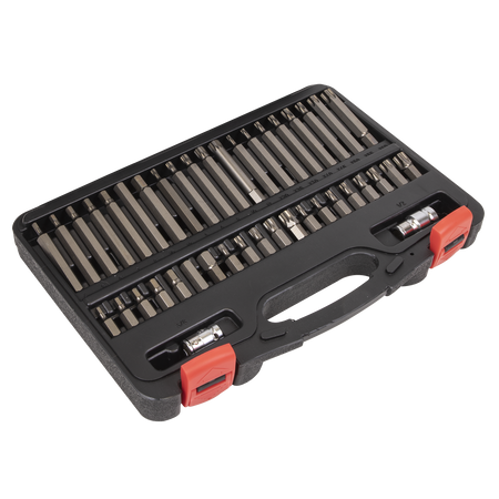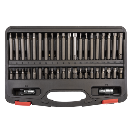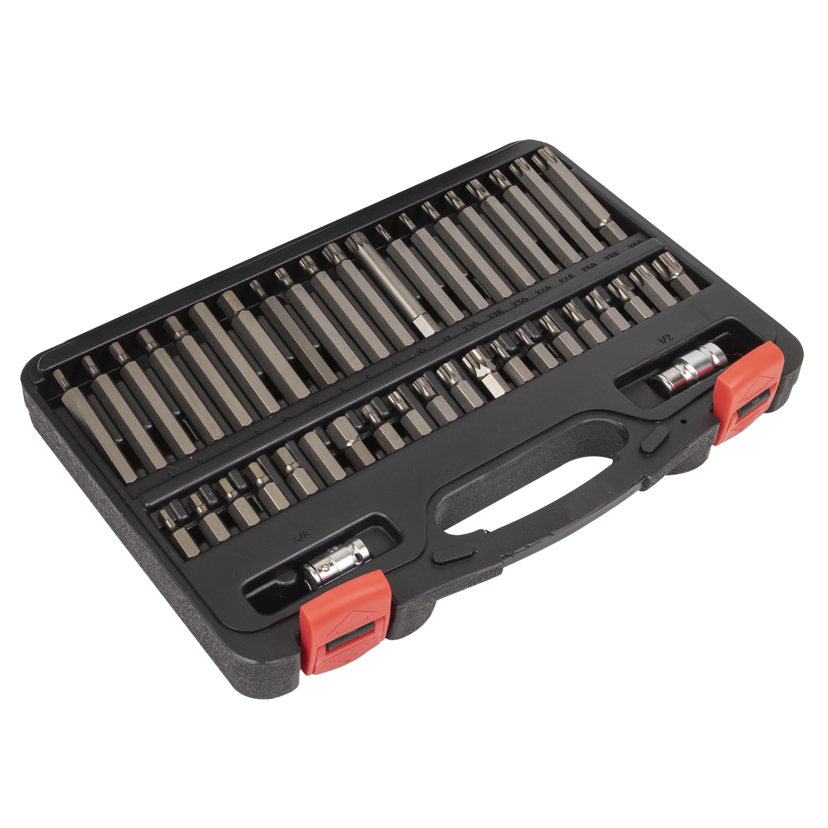 High quality S2 steel bits with a zinc phosphate finish, each size in 30 and 75mm lengths. Hardened (58-62 HRC) and tempered for added strength. Includes 3/8" and 1/2"Sq drive to 10mm hex Chrome Vanadium steel bit adaptors. Supplied in storage case with inclined tray for quick and easy bit selection.