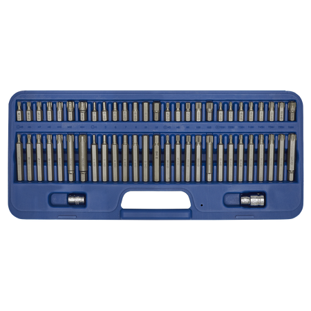 Chrome Vanadium 6150 steel bits hardened to 52-53 HRC and tempered for added strength. Set includes 3/8" and 1/2"Sq drive to 10mm hex Chrome Vanadium steel bit adaptors. Supplied in storage case with inclined tray for quick and easy bit selection.