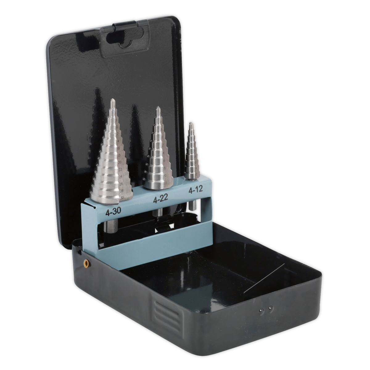 Three high-speed HSS 4341 double flute step drills. Double straight flutes for efficient swarf clearance. 18 Sizes covered by three drill bits. Supplied in a flip-up metal case.,• Three high-speed HSS 4341 double flute step drills.