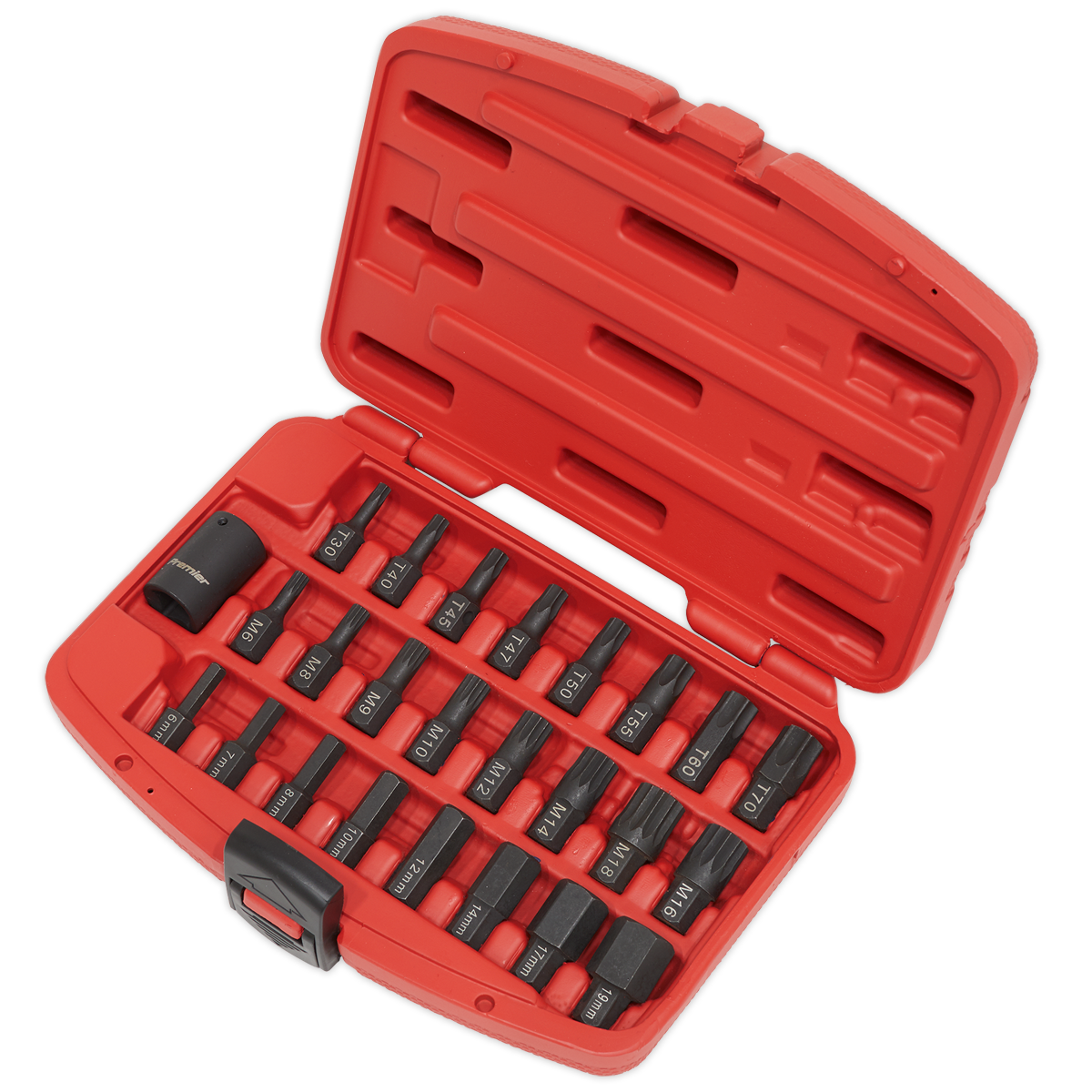 Comprehensive set of TRX-Star*, Hex and Spline bits in Chrome Molybdenum steel, including a 1/2"Sq Drive bit holder with 2mm grub screw. Phosphate finish for corrosion resistance. Supplied in a storage case.