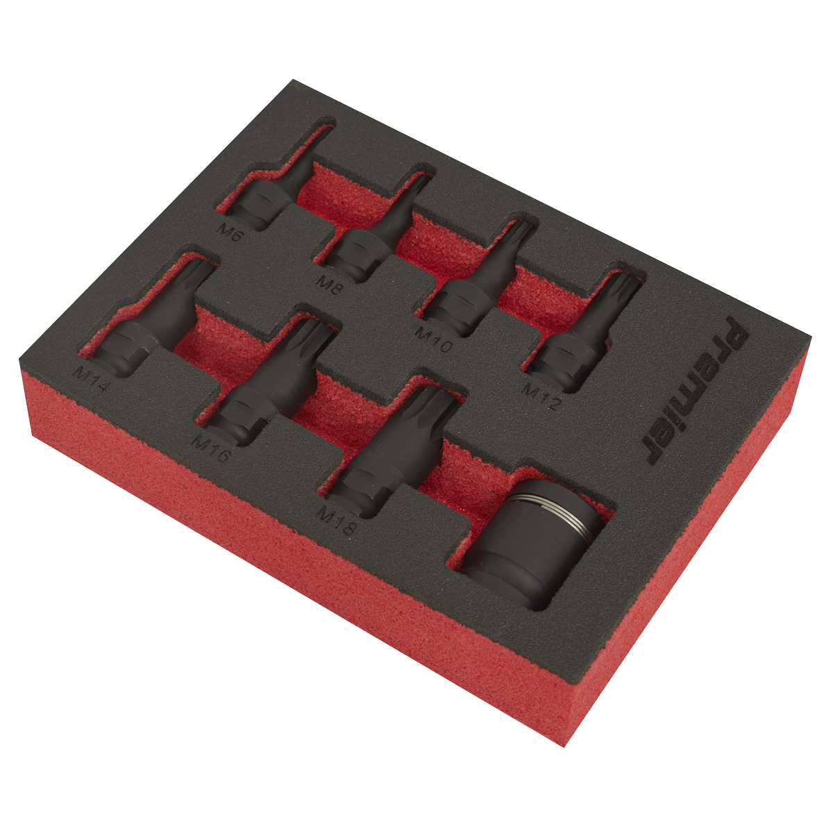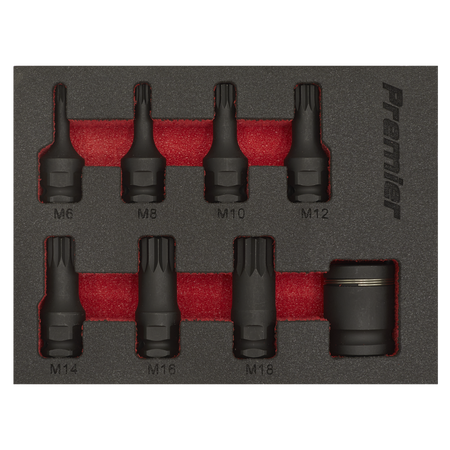 Manufactured from hardened and tempered Chrome Molybdenum steel with a manganese phosphate finish for resistance to corrosion. 3/8"Sq drive impact spline socket bits with an additional locking 1/2"Sq drive quick change adaptor. Supplied in an EVA storage tray.
