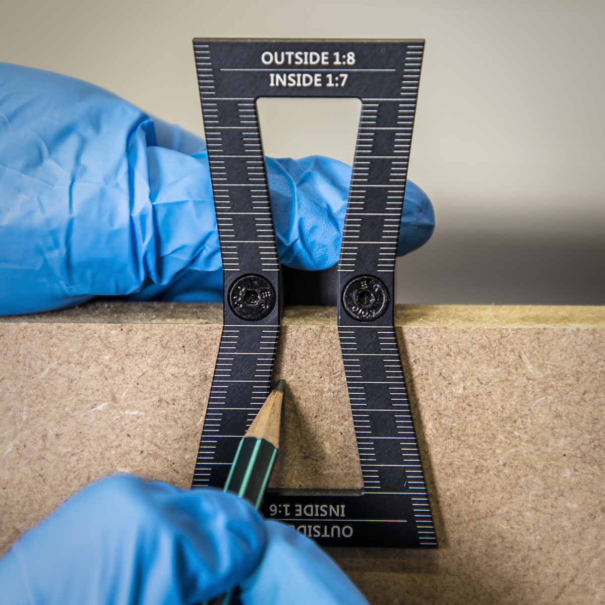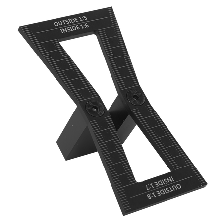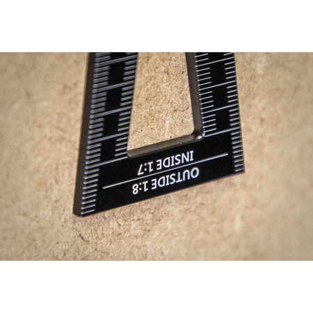 Precision engineered tool for marking out dovetails quickly. CNC Machined from anodised aluminium. Outside edges offer slopes of 1:5 and 1:8 while the inner edges have slopes of 1:6 and 1:7. Suitable for working with either soft or hardwood. Features precision scale for accurate working.