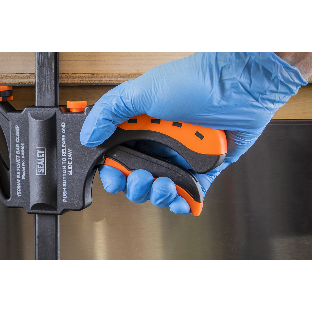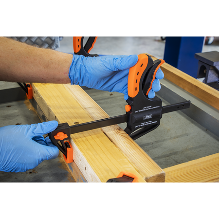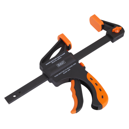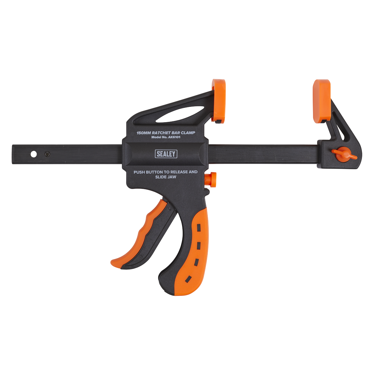 Ratchet action with comfort grip handle and quick release button for fast adjustment. Fixed jaw may be reversed to allow use as a spreader. Resilient clamping faces and 63mm throat.