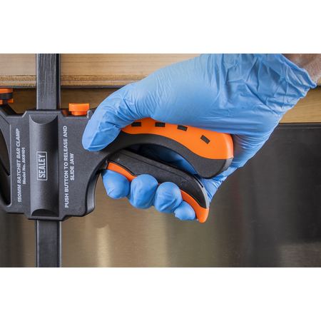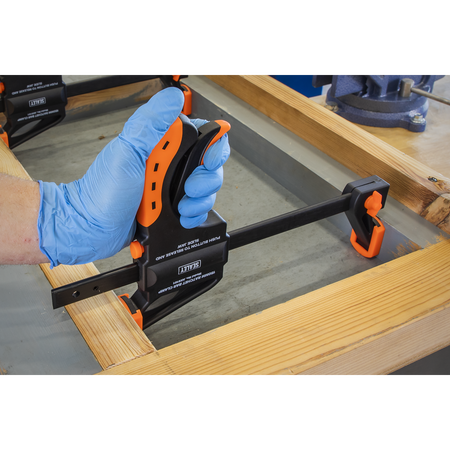 Ratchet action clamps with comfort grip handle and quick release button for fast adjustment. Fixed jaw may be reversed to allow use as a spreader. Resilient clamping faces and 63mm throat.