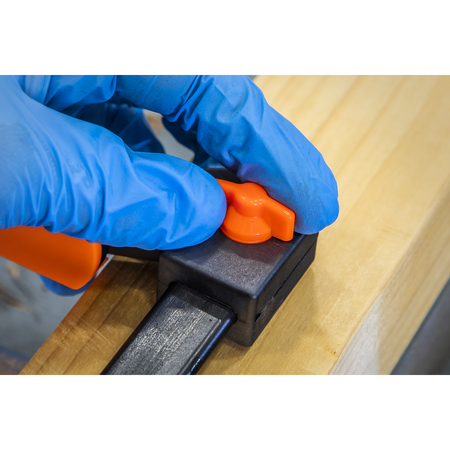 Ratchet action clamps with comfort grip handle and quick release button for fast adjustment. Fixed jaw may be reversed to allow use as a spreader. Resilient clamping faces and 63mm throat.
