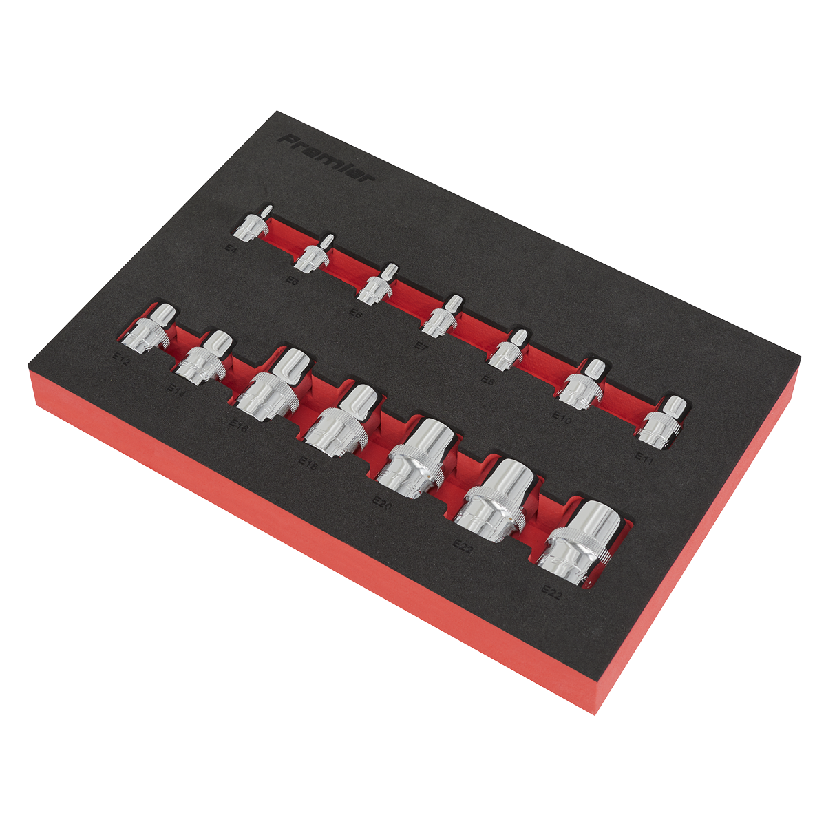 • Sizes: 1/4"Sq Drive; E4-E8, 3/8"Sq Drive; E10-E14, 1/2"Sq Drive; E16-E24.