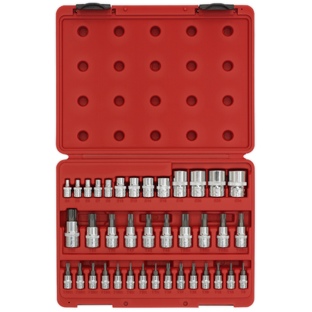 Drop-forged Chrome Vanadium steel sockets with S2 steel TRX-Star* bits. Sockets heat treated and chrome plated for resistance to corrosion. Fully polished mirror finish with knurled ring to assist gripping with oily fingers. Supplied in storage case.