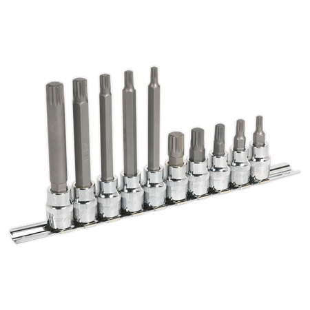 Forged Chrome Vanadium steel 3/8"Sq drive sockets with S2 steel spline bits and fully polished finish. Knurled ring to assist gripping of socket with oily fingers. Supplied on socket rail.