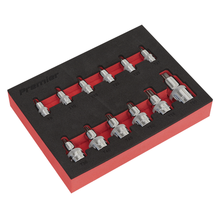 Forged Chrome Vanadium steel sockets with S2 steel hex bits. Sockets are heat treated and chrome plated with a fully polished mirror finish. Knurled rings assist the gripping of the sockets with oily fingers. Supplied in EVA tray.