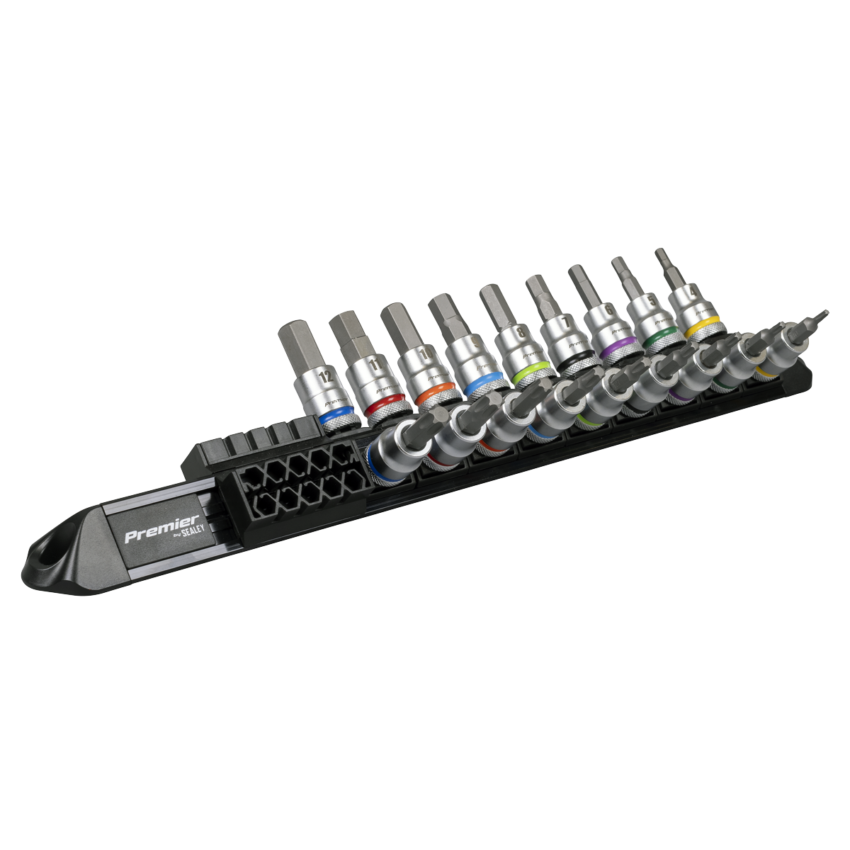 Forged Chrome Vanadium steel sockets with S2 steel bits. Heat treated and chrome plated with a fully polished micro satin finish. Colour-coded rings for fast identification. Supplied on anodised aluminium socket rail with lockable nylon clips.,• SEALEY PREMIER - One of a comprehensive range of Premier Hand Tools, suitable for daily professional use.