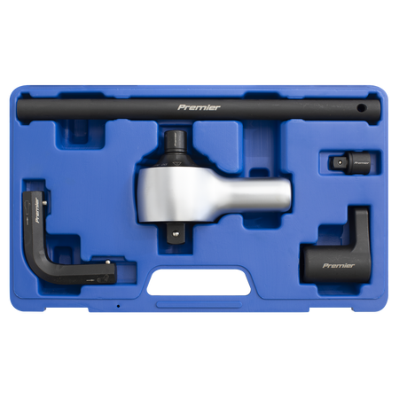Robust construction with 1/2"Sq drive female input and 3/4"Sq drive male output. Accurately delivered torque multiplication factor of 1:6.5. Compatible with a wide range of drive tools including torque and ratchet wrenches. Includes straight and 90° reaction bars, reaction base, two breakaway adaptors* and L-type hex key. Supplied in storage case.