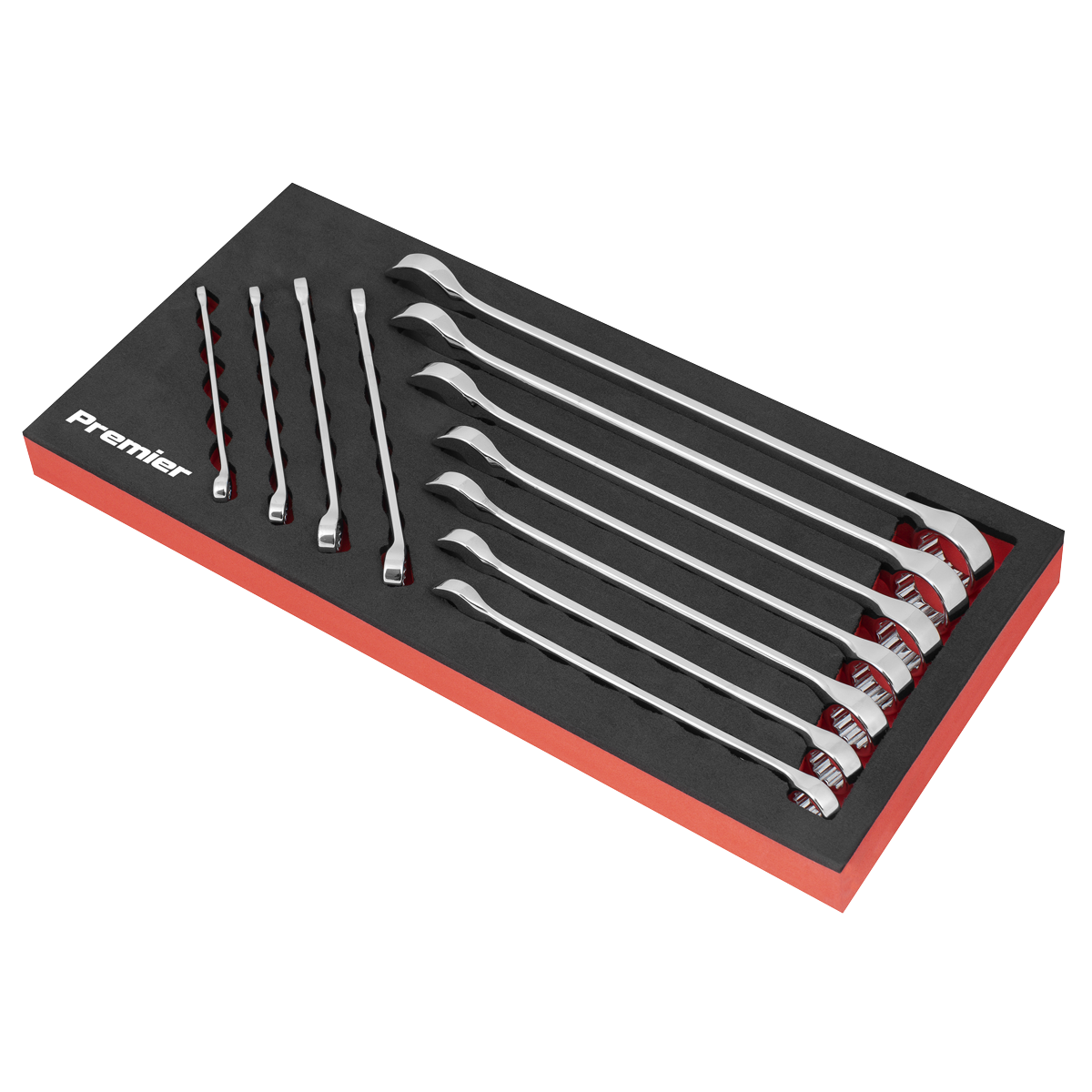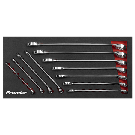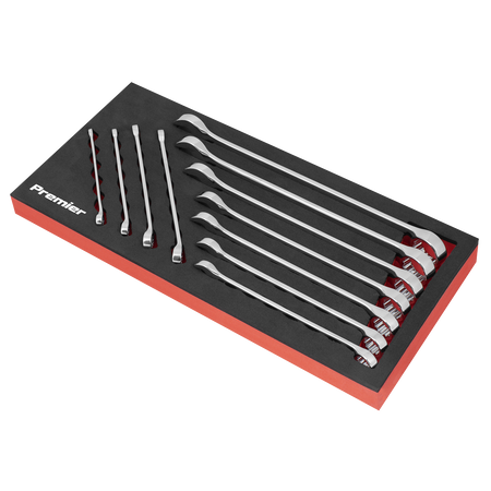 Drop-forged Chrome Vanadium steel spanners. Hardened and tempered with a fully polished, mirror finish. Open-end and WallDrive® ring combination with long slim shaft. Supplied in EVA foam storage tray.