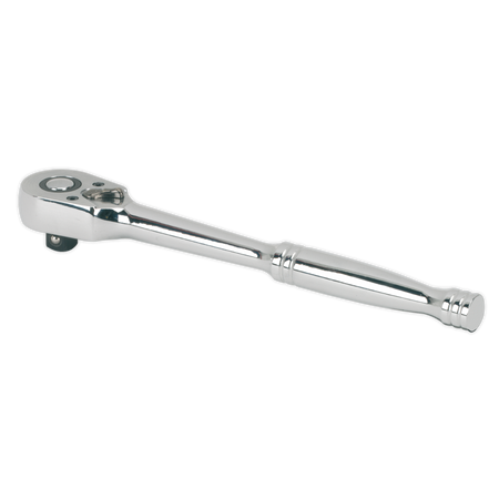 Chrome Vanadium steel gear-to-gear 48-tooth ratchet wrench. Hardened and tempered with a fully polished mirror finish. Slim style contoured handle with pear-head design. Features flip reverse and quick release mechanism.