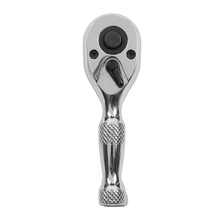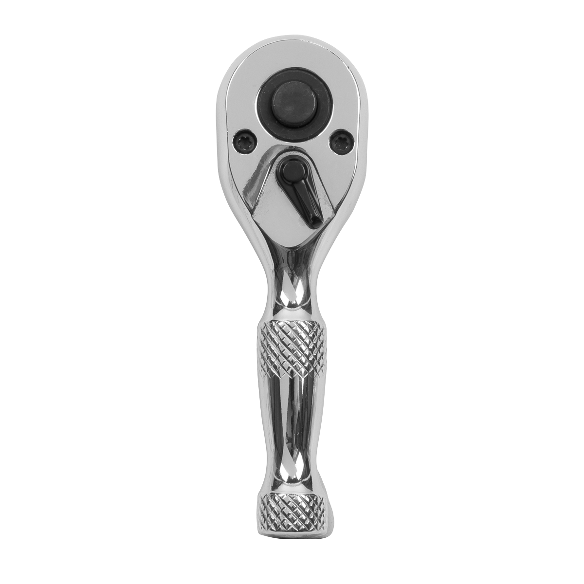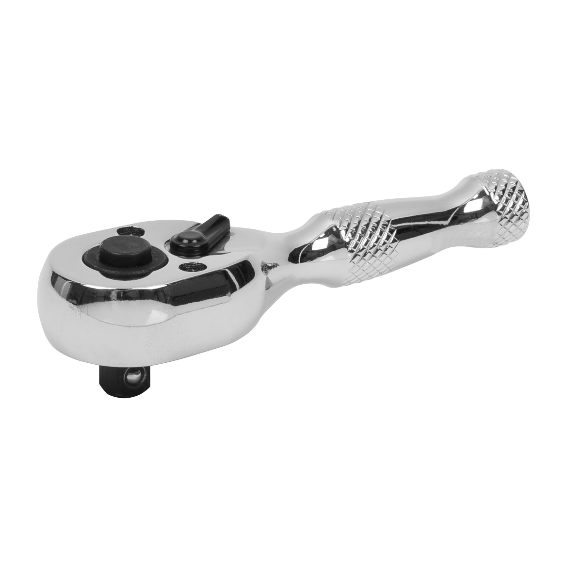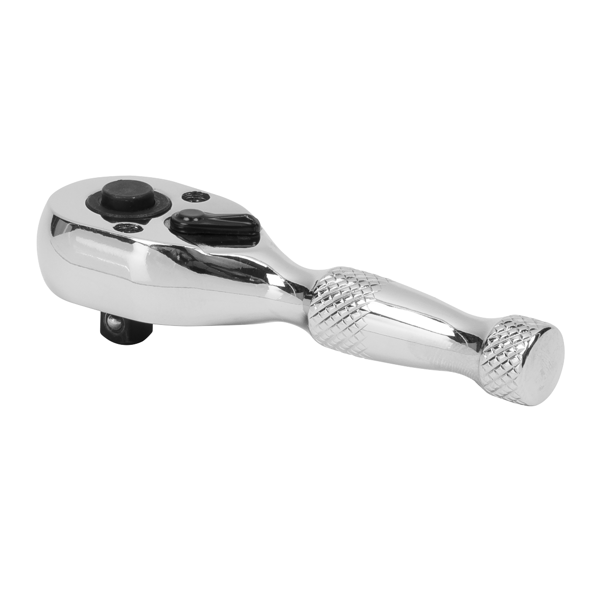 Chrome Vanadium steel 72-tooth gear-to-gear ratchet wrench with a fully polished mirror finish. Contoured handle, for comfort and grip. Pear-head with flip reverse and quick release. Stubby configuration gives improved access in confined spaces.