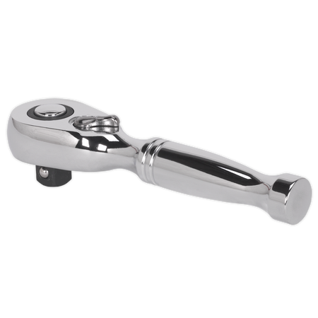 Chrome Vanadium steel 48-tooth gear-to-gear ratchet wrench with a fully polished mirror finish. Contoured handle, for comfort and grip. Pear-head with flip reverse and quick release. Stubby configuration gives improved access in confined spaces.