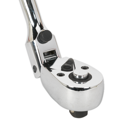 Hardened and tempered Chrome Vanadium steel ratchet wrench with a fully polished mirror finish. Ultra-smooth 72-tooth pear-head ratchet and soft grip handle for added comfort and control. 180° Locking flexi-head and extra-long shaft improves access for hard-to-reach applications. Features flip reverse and spring-ball socket retention.
