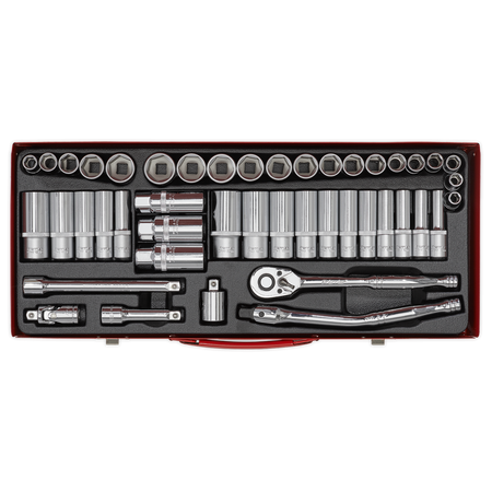 Deluxe professional socket set with heat treated Chrome Vanadium steel WallDrive® sockets. Dual satin/chrome finish. 48-Tooth gear-to-gear quick release ratchet. Supplied in metal storage case.