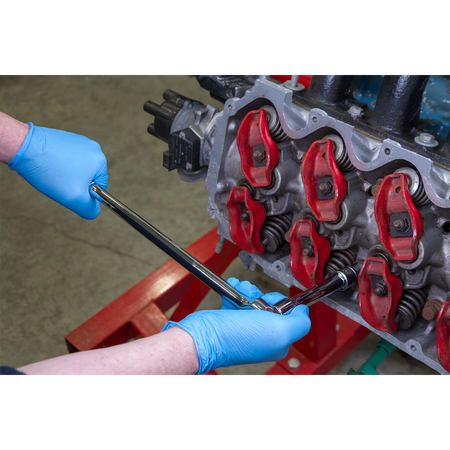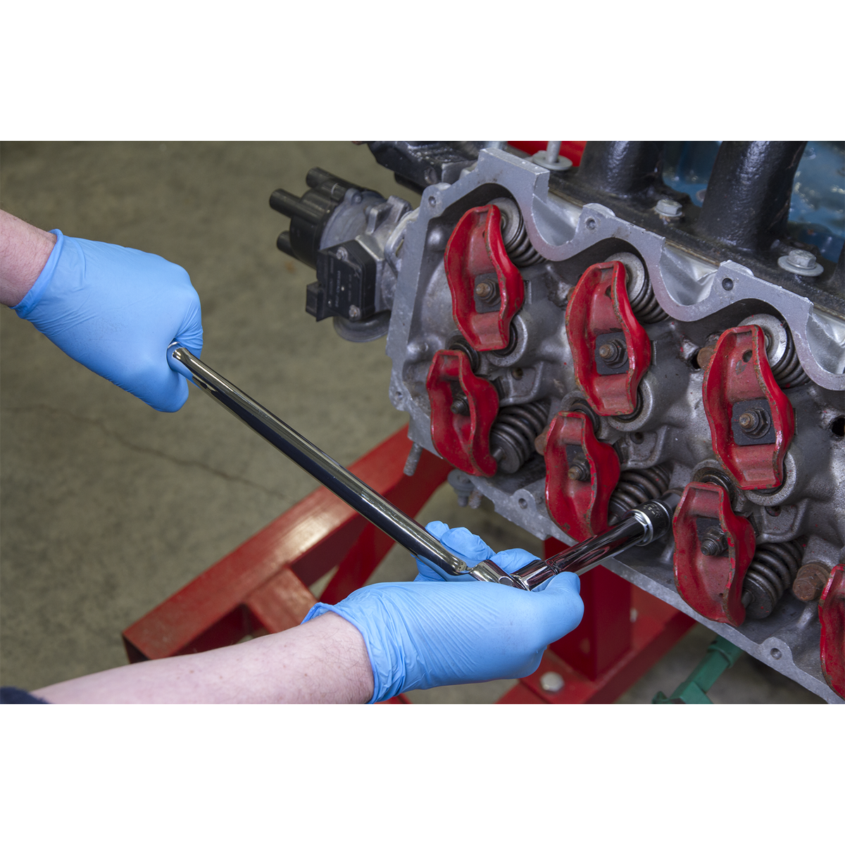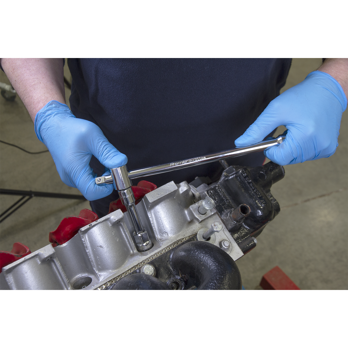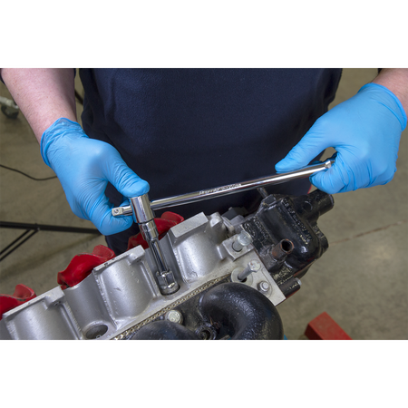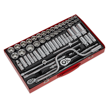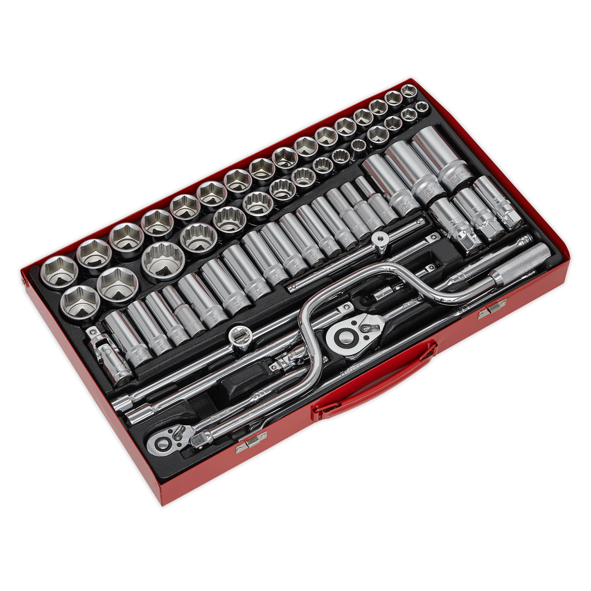 Deluxe professional socket set with heat treated Chrome Vanadium steel WallDrive® sockets. Dual satin/chrome finish. 48-Tooth gear-to-gear quick release ratchet. Supplied in metal storage case.