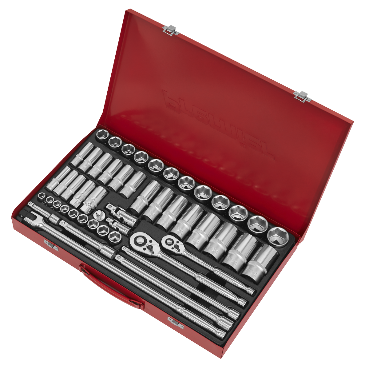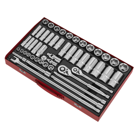 Deluxe professional socket set with heat treated Chrome Vanadium steel WallDrive® sockets. Dual satin/chrome finish. 48-Tooth gear-to-gear quick release ratchet. Supplied in metal storage case.
