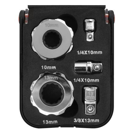 - Contents 10mm Palm Ratchet, 13mm Palm Ratchet, 10mm x 1/4"Sq Drive Socket Adaptor, 13mm x 3/8"Sq Drive Socket Adaptor, 10mm x 1/4"Hex Bit Adaptor