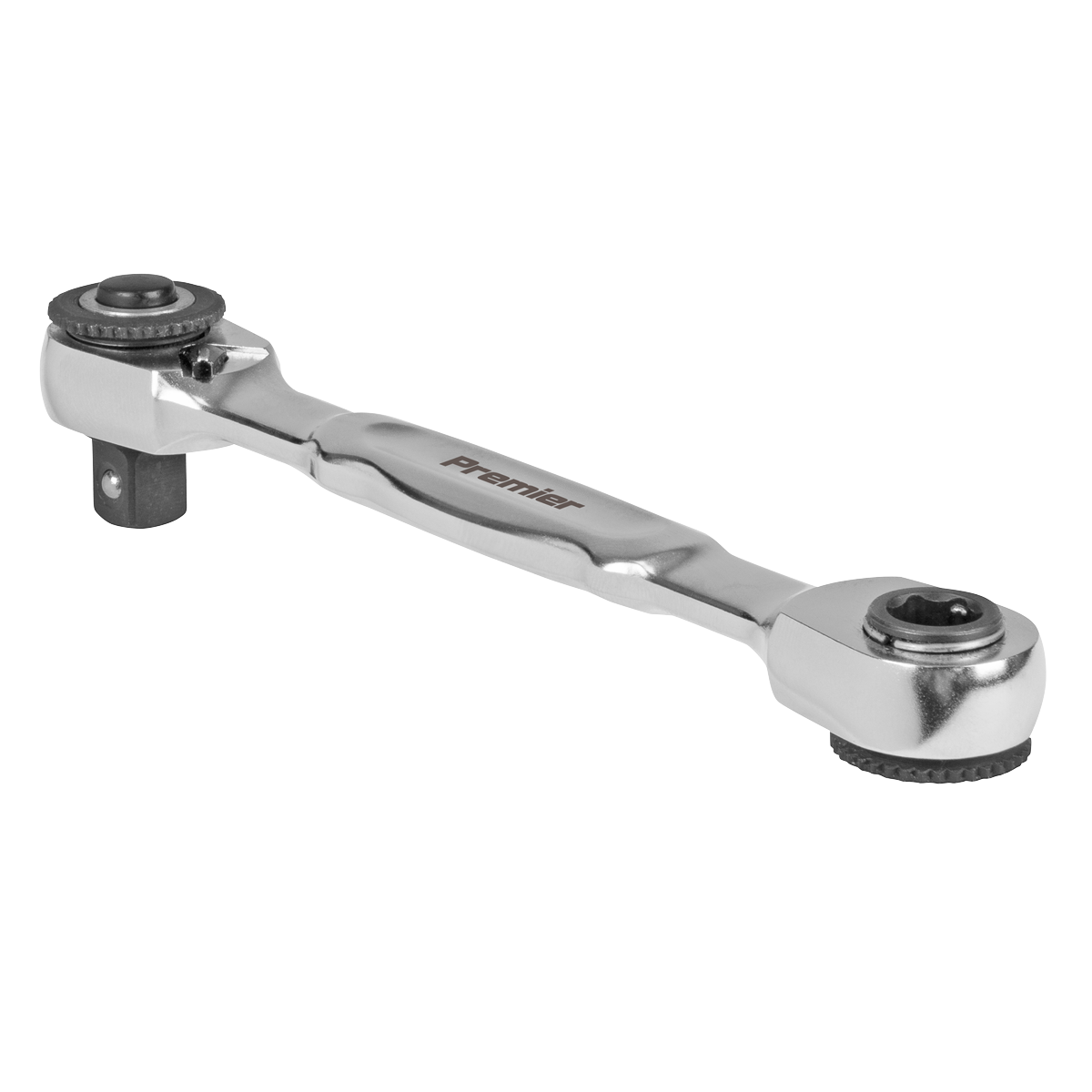 Manufactured from hardened and tempered Chrome Vanadium steel with a fully polished micro satin finish. Double end ratchet spanner combining 1/4"Sq and 1/4"Hex drives. The heads are fitted with a knurled spinner disc to allow rapid tightening/loosening of fixings. Ultra-smooth 72-tooth ratchet action with flip reverse. Ideal for limited access applications.