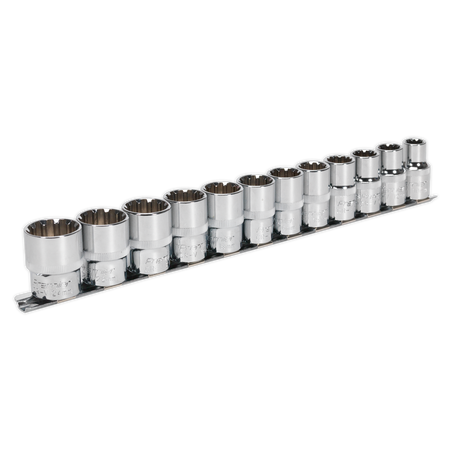 Chrome Vanadium steel Total Drive® sockets, hardened and heat treated for strength with a fully polished mirror finish for resistance to corrosion. Can be used on a wide range of fasteners. All are suitable for Spline, Metric Hex and Bi-Hex, with many also equivalent to TRX-Star*, Whitworth, Imperial Hex and Imperial Bi-Hex. Knurled ring for extra grip with greasy fingers. Supplied on rail.