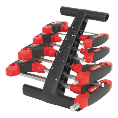 Hardened and tempered Chrome Vanadium steel shafts with a fully polished satin finish. Tough, composite handle with rubberised comfort grip. Long shaft has ball-end, allowing fixing to be driven at up to 30° from its axis. Short element is standard hex. Includes hanging holes and storage stand.