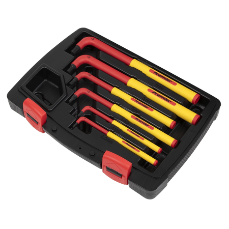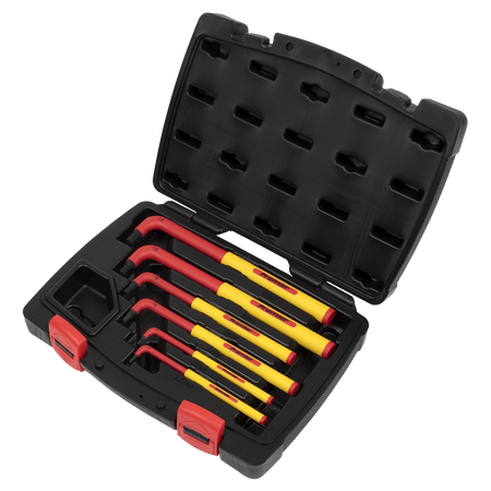 Manufactured from heat treated and hardened S2 steel with a chemically blackened finish for resistance to corrosion. Keys range in length from 135mm to 215mm and in size from 2.5mm to 8mm. Fitted with PP/TPR handles, fully insulated to VDE and EN 60900 standards to protect from electric shocks up to 1500V DC and 1000V AC. Ideal for technicians working on modern hybrid and electric vehicles (1500V DC safe live working). Also suitable for electricians and other trades (1000V AC safe live working). Supplied in storage case.