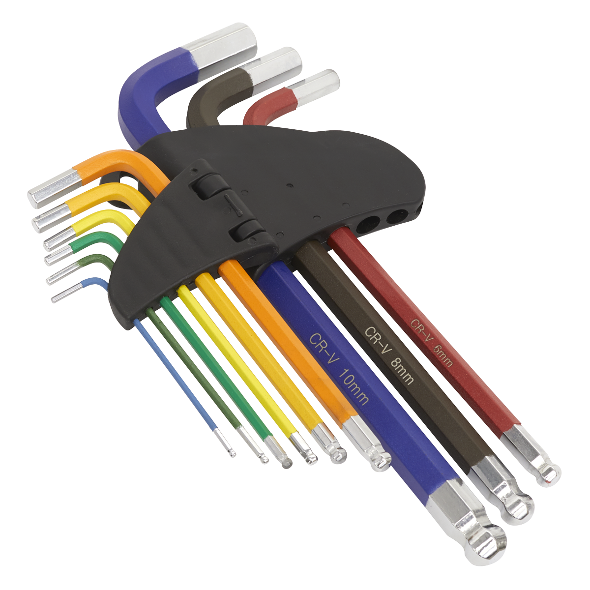 Manufactured from hardened and heat treated Chrome Vanadium steel with a fully polished finish. Keys range in length from 65 to 175mm. Contents: 1.5, 2, 2.5, 3, 4, 5, 6, 8, 10mm. Colour-coded anti-slip coating for comfort, control and fast identification. Supplied in easy-access case for safe storage and quick key selection.