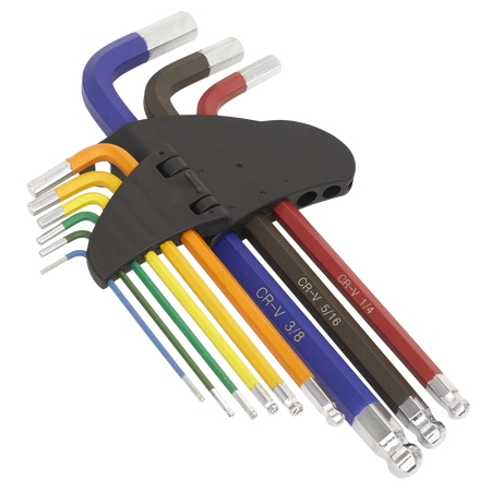 Manufactured from hardened and heat treated Chrome Vanadium steel with a fully polished finish. Keys range in length from 65 to 175mm. Contents: 1/16", 5/64", 3/32", 1/8", 5/32", 3/16", 1/4", 5/16", 3/8". Colour-coded anti-slip coating for comfort, control and fast identification. Supplied in easy-access case for safe storage and quick key selection.