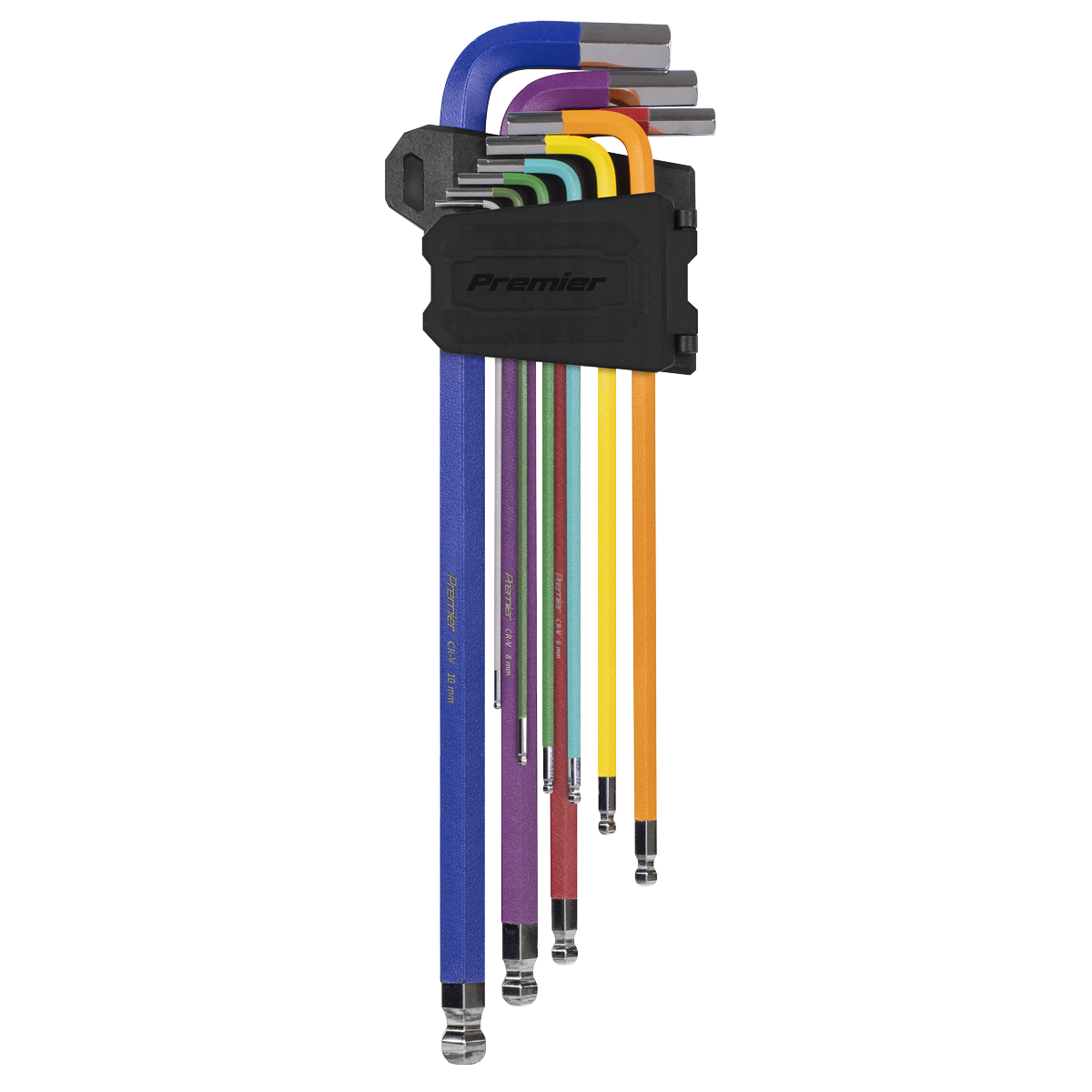 Manufactured from hardened and heat treated Chrome Vanadium steel with a fully polished finish. Keys range in length from 90 to 230mm. Contents: 1/16", 5/64", 3/32", 1/8", 5/32", 3/16", 1/4", 5/16", 3/8". Colour-coded anti-slip coating for comfort, control and fast identification. Supplied in easy-access holder for safe storage and quick key selection.