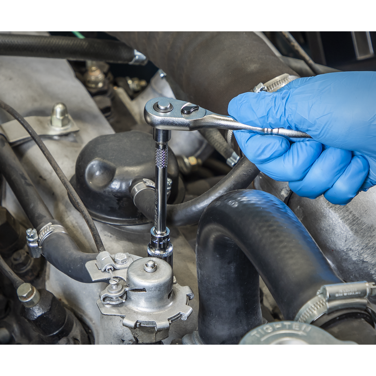 Chrome Vanadium steel gear-to-gear 90-tooth ratchet wrench. Hardened and tempered with a micro satin finish. Slim style contoured handle with pear-head design. Features flip reverse and quick release mechanism.