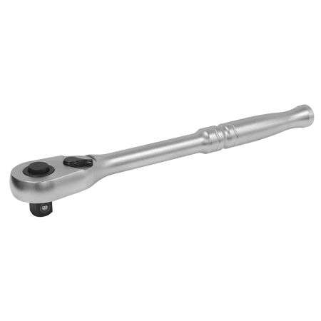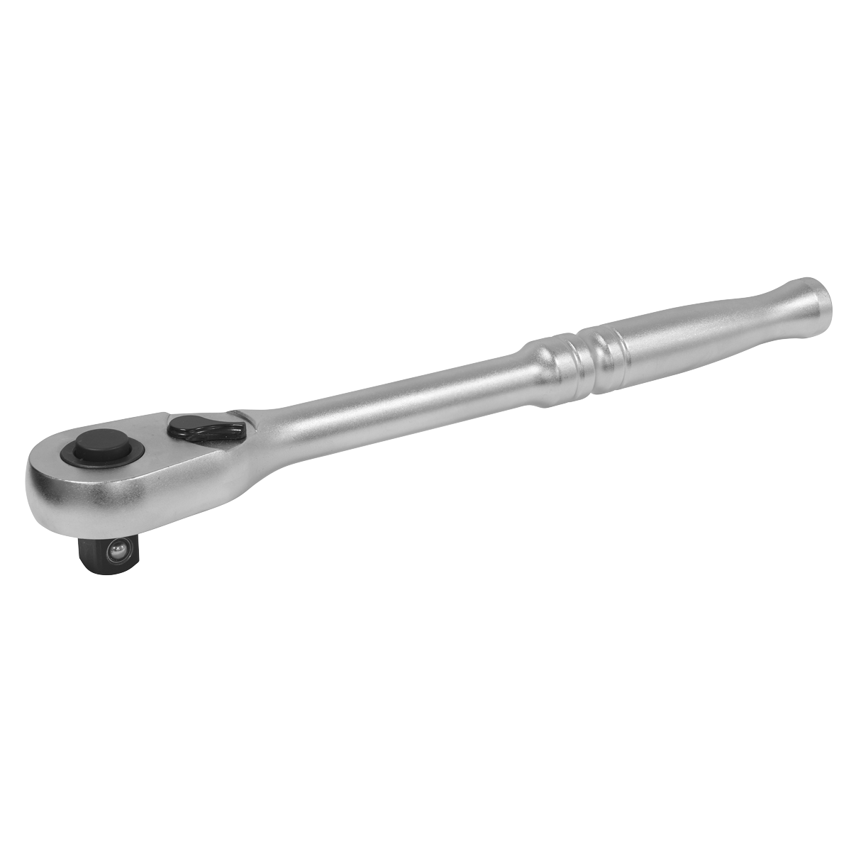 Chrome Vanadium steel gear-to-gear 90-tooth ratchet wrench. Hardened and tempered with a micro satin finish. Slim style contoured handle with pear-head design. Features flip reverse and quick release mechanism.