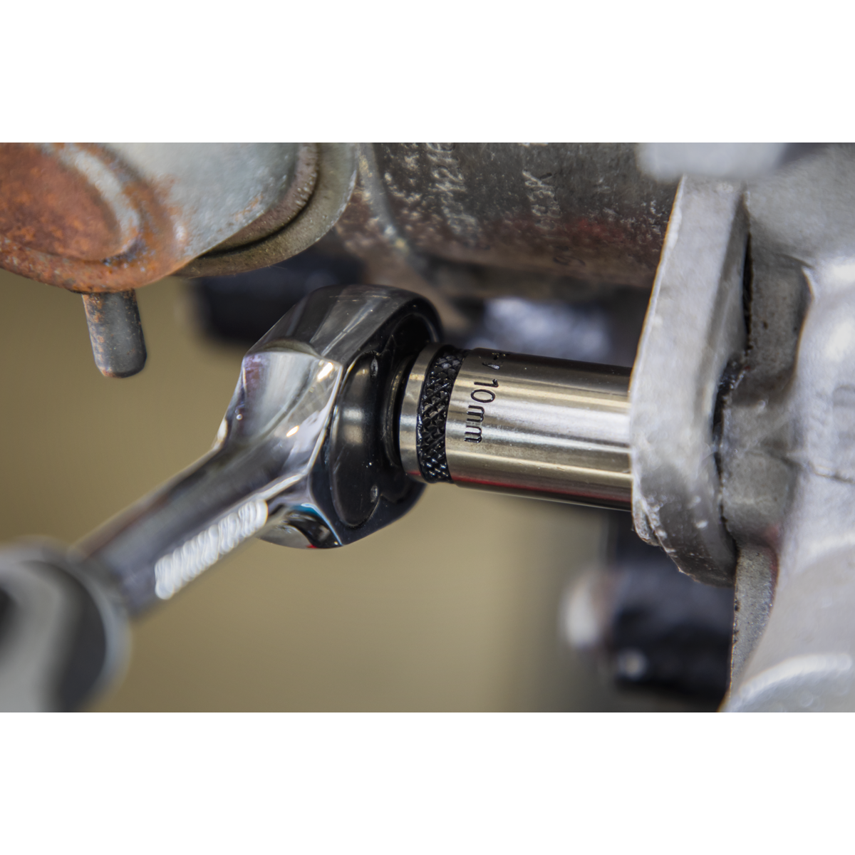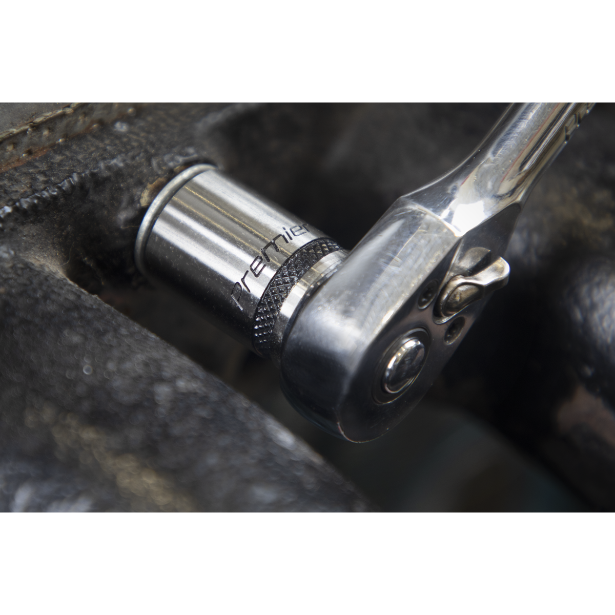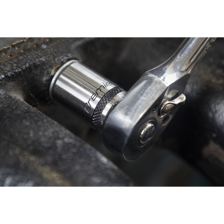 Manufactured from hardened and tempered high grade Chrome Vanadium steel. Fully polished black chrome finish for resistance to corrosion. Includes knurled ring for extra grip with oily fingers. Supplied on socket rail.