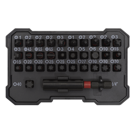 • Contents: 25mm Bits; Slotted - 4.5, 5.5, 6.5mm, Phillips - #1, #2 (x3), #3, Pozi - #1, #2 (x3), #3 (x2), TRX-Star* - T10, T15 (x2), T20 (x2), T25 (x3), T27, T30 (x3), T40, Hex - 3, 4, 5, 6mm, 60mm Bit Holder.